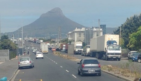 Eine lange Schlange von Lastwagen in Salt River, die Obst zum Containerterminal in Kapstadt bringen, wo es wahrscheinlich tagelang warten wird, bevor es verladen wird.