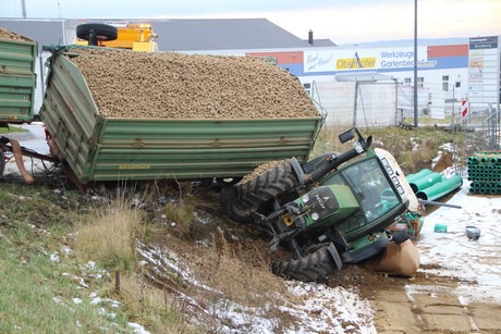 Glücklicherweise kippte der Anhänger nicht auf den Traktor und blieb der 79-Jährige Fahrer des Gespanns unverletzt. Neben der Ladung ist auch eine großflächige Ölspur beseitigt worden. Der gesamte Schaden werden nach den vorläufigen Angaben auf ca. 4.000 gestellt.