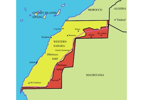 Die Westsahara ist geteilt, der Westen steht unter der Kontrolle Marokkos (gelb), der äußere Osten und Süden wird von den Polisario (rot) gehalten