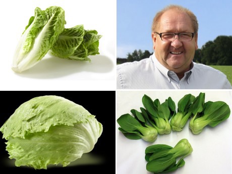 Vorstandsvorsitzender Rudolf Behr (rechtsoben) und seine erfolgreichste Produkten: die Mini-Romana (linksoben), Eisbergsalat (linksunten) und Mini-Pakchoi (rechtsunten)