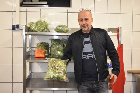 Geschäftsführer Mehmet Celebi zeigt einen Flowpack mit gemischtem Salat