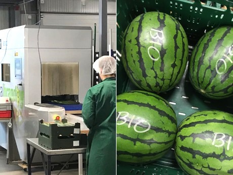 Möglich macht dies die Maschine NB3002, die zwischen 4.000 und 6.000 Gurken pro Stunde per Laser kennzeichnet. Dabei werden die obersten Schalenpigmente abgetragen und so ein Logo oder Schriftzug in die Schale geprägt – und zwar ohne die Frucht zu verletzen. Der Typ NB 3002 ermöglicht durch das eingebaute Transportband das Kennzeichnen „On the Fly“. Dies bedeutet, die Maschine kennzeichnet das Obst im Durchlauf ohne zu stoppen. Die Software berechnet automatisch die optimale Bandgeschwindigkeit. Dadurch wird die Maschinenkapazität optimal genutzt.