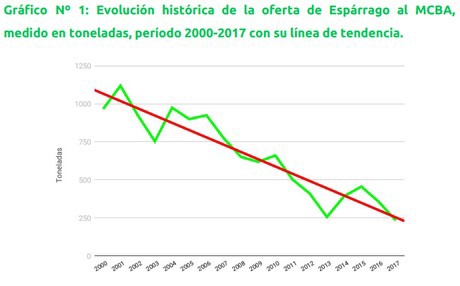 Im Jahr 2017 betrug das Angebot an Spargeln auf dem Zentralmarkt von Buenos Aires 234 Tonnen, 34,5% weniger als im Vorjahr. Wie man der folgenden Grafik entnehmen kann, befindet sich das Angebot im Laufe der Jahre in einem rückläufigen Trend. Die Monate mit den größten verfügbaren Mengen waren September, Oktober und November. Die Menge dieser Monate macht zusammen 85% des Gesamtangebots im Jahr 2017 aus. Diese Information wurde im Newsletter Boletín de Frutas y Hortalizas /Convenio INTA-CMCBA numero 85 veröffentlicht.