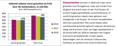 Im Jahr 2018 gab der Verbraucher 5 Prozent mehr für frisches Obst und Gemüse für den Heimgebrauch aus. Die Niederländer kauften etwas mehr frisches Gemüse (+ 1%), aber weniger frisches Obst (-3%). Der durchschnittliche Verbraucherpreis für ein Kilogramm frisches Obst lag um 10 Prozent höher, sodass die Ausgaben für Obst um 6 Prozent stiegen. Insbesondere Äpfel waren aufgrund des geringen Angebots im ersten Halbjahr 2018 teurer. So wurden 10 Prozent weniger Äpfel gekauft. Dies zeigt, dass der Produktpreis das Kaufverhalten beeinflusst. Äpfel machen 20 Prozent des gesamten Obsteinkaufs aus, was bedeutet, dass ein Rückgang den gesamten Obsteinkauf stark beeinflusst. Der Obst- und Gemüsesektor befürchtet, dass sich die Mehrwertsteuererhöhung bei Obst und Gemüse negativ auf den Umsatz auswirken wird, insbesondere für Verbraucher mit einem kleineren Portemonnaie. Genau diese Gruppe hat viel Nachholbedarf, um die täglich empfohlene Menge an Obst und Gemüse zu konsumieren.
