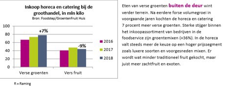Mengenmäßig stieg der Absatz von Frischgemüse in Gastronomie und Catering um sieben Prozent. Dies ist eine Abflachung nach einem starken Volumenwachstum in den vergangenen Jahren. Die Gastronomie wählt zunehmend luxuriösere Produkte wie Premium-Typen und vorgeschnittene Mischungen. Die Erklärung findet man im zunehmenden Druck auf die Köche, originell zu sein mit Menüs ohne zu viel zusätzlichen Aufwand. Dabei achtet man auch auf eine gute Portionierung und weniger Abfall. Die Nachfrage nach Heidelbeeren und Himbeeren wächst weiter und die Gastronomie überrascht ihre Gäste zunehmend mit Mango.