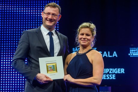Heike Fischer-Jung, einstige Weltklasse-Wasserspringerin und Vizepräsidentin des Landessportbundes, überreichte Mathias Möbius, Vorstand der Obstland Dürrweitzschen AG, die Sächsische Sportkrone (Quelle: Kristin Schmidt/LSB).