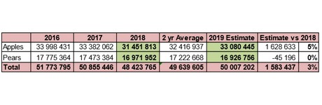 Die Hitzewelle vom Oktober 2018 wirkte sich negativ auf Packhams Triumph aus, da die Bäume in voller Blüte standen. Das Exportvolumen wird auf das Niveau der letzten Saison geschätzt: 5,62 Mio. Kartons. Williams Bon Chretien erwartet ebenfalls einen Rückgang der Mengen um 7%, was auf eine geringere Fruchtgröße zurückzuführen ist.