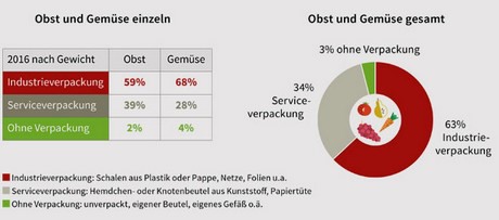 Inzwischen sind 59 Prozent des Obstes und 68 Prozent des Gemüses, das private Haushalte im Supermarkt oder auf dem Wochenmark kaufen, bereits industriell vorverpackt. Das heißt, die Kunden haben nicht die Möglichkeit, einen Servicebeutel zu nutzen oder sogar ganz auf eine Einwegverpackung zu verzichten, beispielsweise durch mitgebrachte Beutel.