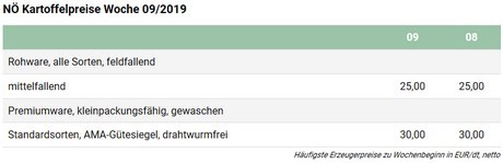 Im Burgenland wurden mittlerweile die ersten Kartoffeln unter Folie gepflanzt. Bei den Erzeugerpreisen gibt es keine Änderung zur Vorwoche. In Niederösterreich werden Speisekartoffeln meist um 25 Euro/100 kg übernommen. Für drahtwurmfreie, kleinpackungsfähige Premiumware mit AMA-Gütesiegel sind bis zu 30 Euro/100 kg zu erzielen. In Oberösterreich wurden wurden zuletzt bis zu 29 Euro/100 kg bezahlt.