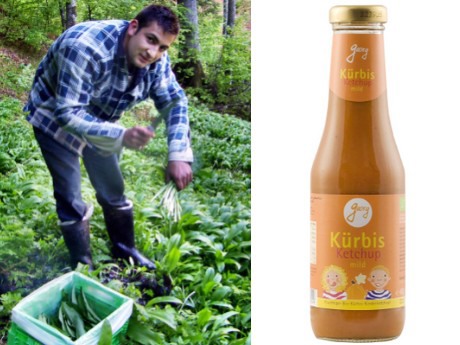 Links: Bärlauchernte im Buchenwald, Rechts: der Kürbis-Ketchup, eine bewährte Spezialität im bestehenden Sortiment.