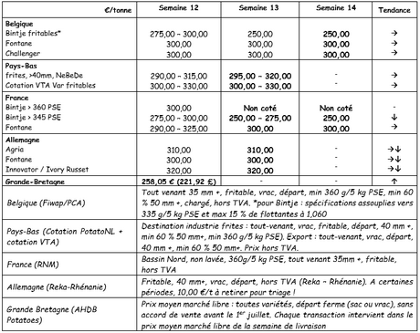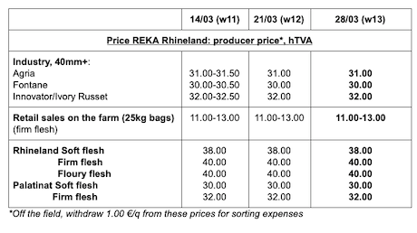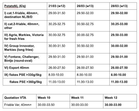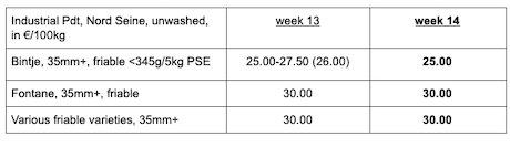 Industriesorten: Sehr wenige Transaktionen auf einem, als ruhig eingestuften, Markt. Käufer für Fontane und Challenger warten und kaufen nicht für die direkte Lieferung. Es besteht eine gewisse Nachfrage nach einer verspäteten Lieferung (Mai). Das Angebot ist nicht groß, aber ausreichend. Der Markt für Bintje steht still. Schäler (halbindustriell oder kleiner) kaufen immer noch Kartoffeln. Der Trend ist ruhig (Angebot höher oder gleich der Nachfrage).