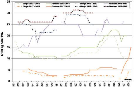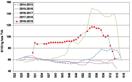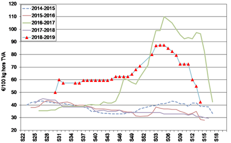 Lagerbestände Ende Februar (Quelle: UNPT / CNIPT): Die Lagerbestände der französischen Hersteller wurden Ende Februar auf 1.254.000 Tonnen geschätzt, verglichen mit 1.939.000 Tonnen Ende Februar 2018 und 1.580.000 Tonnen Ende Februar 2017. Etwa 70% dieser Bestände sind für die verarbeitende Industrie bestimmt.