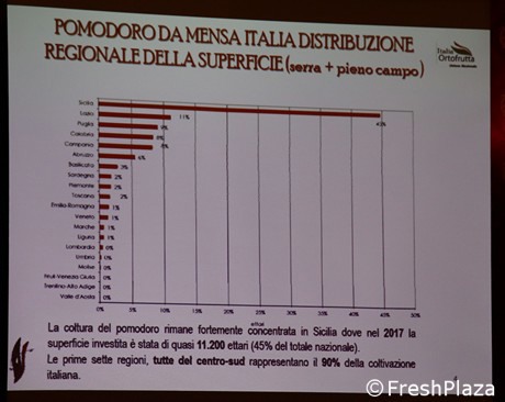 Vincenzo Falconi, Direktor von Italia Ortofrutta, präsentierte die Daten zur Kampagne 2018/19. Im Jahr 2017 wurden auf rund 25.000 Hektar (Gewächshäuser und Freiflächen, letztere über 70%, insgesamt fast 1 Million Tonnen) Tafeltomaten angebaut. Sizilien produziert 45% des Inlandsumsatzes (siehe Grafik unten).