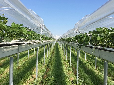 Geschützter Anbau auf Stellagen im Freiland ist die neueste Variante in Sachen Erdbeeranbau.