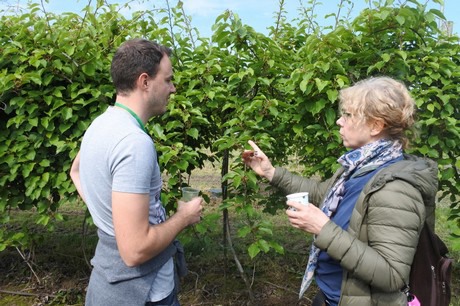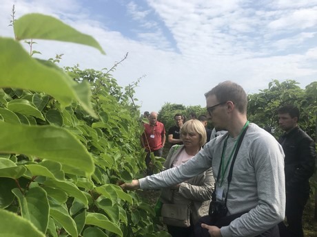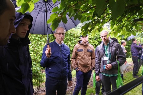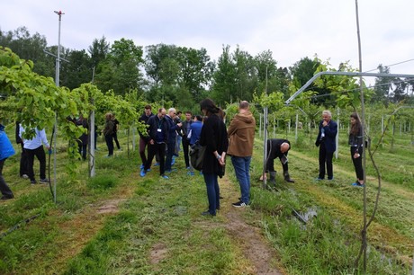 Neben der Theorie gab es auch viel Zeit für die Praxis: Es wurden natürlich auch Kiwibeerenplantagen besucht. Bei der Universität wurde der Kollektivgarten von Prof. Piotr Latocha besucht, der Heimathafen der Bingo-Sorte. In die Obstgärten von Minikiwi Kostrzewa (3ha) und Grzegorz Kostrzak (1,33ha) wurde auch eingeladen. Wie jedes Jahr gab es wieder sehr viel Interesse daran, wie das Stutzen, die Düngung und Bestäubung etc. angepackt werden. Das Abwägen der Vor- und Nachteile der unterschiedlichen Systeme in den unterschiedlichen Ländern führte immer wieder zu spannenden Diskussionen. Es gab auch Zeit, um andere Kulturen anzuschauen wie die Kornelkirsche (Cornus mas), Erdbeeren (Rinnen auf Kokossubstrat) und Brombeeren in Töpfen (long cane).