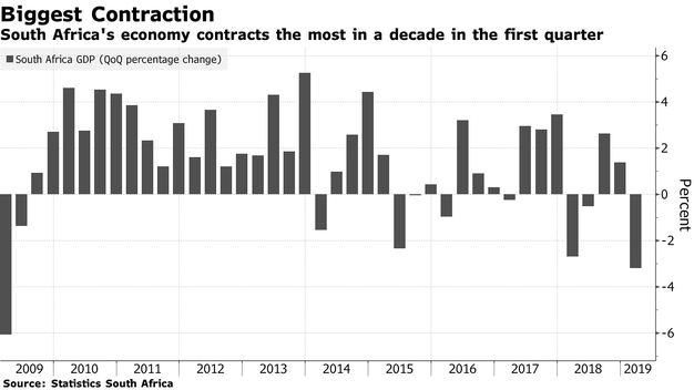 Schuld ist vor allem der staatseigene Eskom, der fast ganz Südafrika mit Strom versorgt. Aufgrund von Misswirtschaft, Korruption, veralteten Einrichtungen und einer Verschuldung von mehreren Milliarden fällt der Strom im Land zunehmend aus, was seiine Auswirkungen auf andere Sektoren im Land wie den Bergbau und die Industrie hat. Der Handelskrieg zwischen China und den USA spielt ebenfalls eine Rolle und setzt der Wirtschaft des Landes erheblich zu.