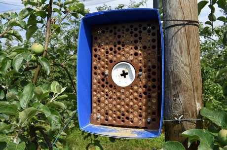 Um der Invasion durch Insektenschädlinge auf natürliche Weise zu begegnen, sind die Obstgärten mit Geräten zur sexuellen Verwirrung ausgestattet. Fledermausnester und Insektenhotels wurden zwischen den Apfelbäumen platziert. "Wir denken sogar darüber nach, Hühner in die Obstgärten zu lassen, um Insektenschädlinge zu bekämpfen", ergänzt Laurent. Die Bestäubung wird von europäischen Bienen sichergestellt, die ein Imker aufzieht, aber auch von Osmia-Bienen, die in den Insektenhotels in den Obstgärten Zuflucht finden.