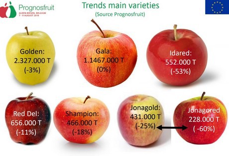 Am vergangenen Donnerstag wurden während der Prognosfruit im belgischen Alden Biesen die Kernobstprognosen präsentiert. Die europäische Apfelproduktion wird in diesem Jahr voraussichtlich 10.556.000 Tonnen erreichen. Das sind 20% weniger als im Vorjahr und 8% weniger als der Durchschnitt der letzten drei Jahre.