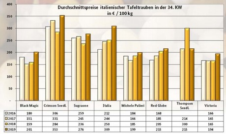 Bei den Tafeltrauben dominierte Italien mit Victoria, Michele Palieri und Crimson Seedless und ergänzte mit Black Magic und Red Globe das Geschehen. Italia und erste Thompson Seedless fielen mitunter zu kleinfruchtig aus und generierten daher nicht immer eine freundliche Beachtung. Die Präsenz türkischer Sultana weitete sich immens aus: Die Offerten wurden in 5-kg-, 7-kg- und 9-kg Steigen umgeschlagen und gewannen ab Mittwoch merklich an Bedeutung. Ihre Notierungen bröckelten aufgrund der ausgedehnten Verfügbarkeit aber. Griechenland beteiligte sich mit Flame Seedless und Prime Seedless und schickt mittlerweile auch Thompson Seedless, die in Frankfurt zwischen 10,- und 18,- € je 4,5-kg-Karton kosteten. Spanische Anlieferungen tauchten nur in einem spärlichen Rahmen auf. Französische Alphonse Lavallée gesellten sich zu den bereits etablierten Prima, deren Wichtigkeit schwand.