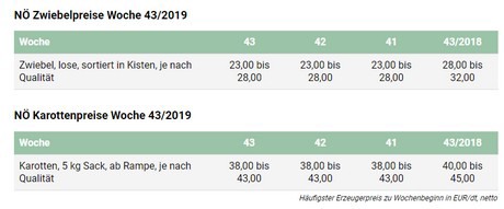 Die Zwiebelvermarktung in Niederösterreich läuft in so ruhigen Bahnen wie in der Vorwochen weiter. Im Inland fällt der Absatz nach den Herbstaktionen wieder ruhiger aus. Dafür verstärken sich langsam die Exportaktivitäten, wobei dort besonders große Ware gesucht wäre. Die Preise bleiben bei positiver Grundstimmung unverändert. Für Zwiebel, geputzt und sortiert in der Kiste werden bei entsprechender Qualität und Größe meist zwischen 23 und 28 Euro/100 kg bezahlt.