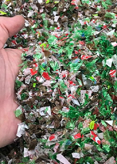 Daraus entstand die Idee, diese oft deponierte Kunststoffart zu verwenden, die von vielen Recyclern (insbesondere farbigen PET-Flaschen) gemieden wird, während hölzerne Fruchtpaletten im Westkap an Wert gewinnen. Jetzt entfernen sie jeden Monat 400 Tonnen Kunststoff aus dem Abfallstrom (rechts: Kunststoffflocken, die in eine Palette umgewandelt werden).