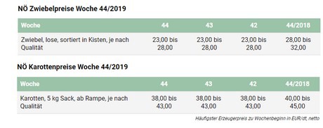 Fortgesetzt stabil präsentiert sich der NÖ Karottenmarkt. Bei kühleren Tagestemperaturen schreiten die Erntearbeiten für die Einlagerung rasch voran. Mit fortschreitender Ernte bestätigt sich die prognostizierte durchschnittliche Erntemenge immer mehr. Jedoch dürfte die Nettoausbeute heuer durch starken Mäusefraß doch geringer ausfallen, als ursprünglich erwartet. Bei den Erzeugerpreisen gibt es keine Änderung zur Vorwoche.