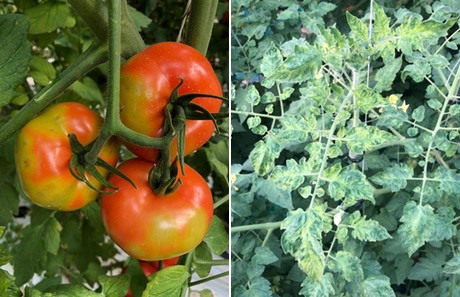 Links: Vom Jordan-Virus befallene Tomaten-pflanze mit typischer „runzeliger“ (= rugose, englisch) Verfärbung der Früchte.