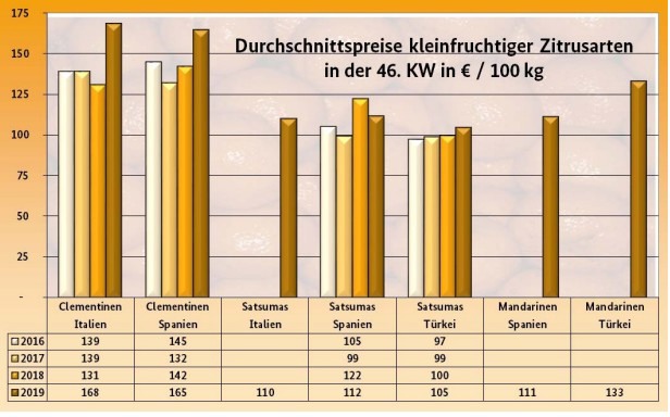 Bei den kleinfruchtigen Zitrusfrüchten herrschten Clementinen vor. Sie kamen in überwiegendem Maße aus Spanien. Italienische Abladungen hatten bloß ergänzenden Charakter. Die Saison von spanischen Satsumas befand sich vor ihrem Abschluss: Die Artikel stammten vorrangig aus der Türkei, spanische Chargen rundeten die Warenpalette also nur noch ab. Die türkischen Importe konnten dank ihrer niedrigen Bewertungen in der Regel flott untergebracht werden. Mandarinen aus Spanien hatten die Konkurrenz aus Südafrika völlig aus dem Geschäft gedrängt und standen somit, abgesehen von wenigen türkischen Anlieferungen, monopolartig bereit.