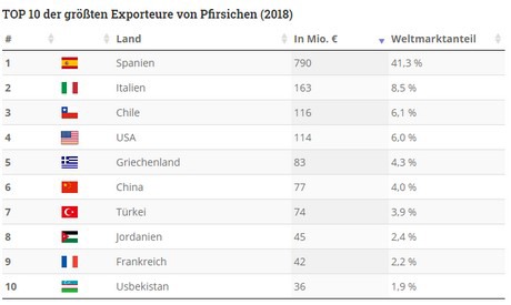 Spanien ist der weltweit führende Exporteur von Pfirsichen. Die Länder Italien und Chile folgen im Jahr 2018 als die global nächst wichtigsten Exporteure. Der weltweite Exportmarkt summierte sich dabei auf rund 1,9 Milliarden Euro. Dies geht aus einer Statistik des International Trade Centre (ITC) hervor.