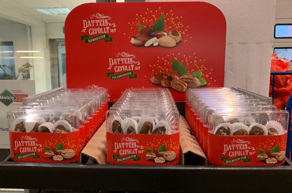 "Gerade zur Weihnachtszeit ist die Dattel Produkt das bei den Konsumenten gut ankommt. Wir haben uns vorher nie mit Produkten dieser Art auseinander gesetzt und ich selbst kannte gefüllte Datteln auch nur aus dem Feinkostbereich." Die Idee, gefüllte Datteln im Sortiment anzubieten kam im Zuge des Weihnachtsmarktes des Unternehmens, der im November am Sitz in Aschaffenburg stattfand. "Das Angebot wurde am Tag des Weihnachtsmarktes so gut angenommen, dass wir gerade mit Lieferproblemen zu kämpfen haben, da wir auf die neu produzierte Ware warten müssen. Nun sind wir in der Lage einen LEH-Markt mit gefüllten Datteln in vier Variationen zu versorgen." Gepackt sei die Ware in weihnachtlichen Schalen und könne auf einem passenden Display präsentiert werden. "So kann das Produkt zu einem massentauglichen Preis verkauft werden."