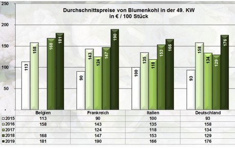Italienische Anlieferungen dominierten den Blumenkohlmarkt offensichtlich vor den französischen Abladungen. Belgische Produkte ergänzten, einheimische und spanische komplettierten das Angebot. Die Verfügbarkeit hatte sich insgesamt eingeschränkt. Sie genügte mancherorts nur knapp, um den Bedarf zu decken. In der Folge kletterten die Notierungen aufwärts. Bis zu 14,- € je 6er-Aufmachung