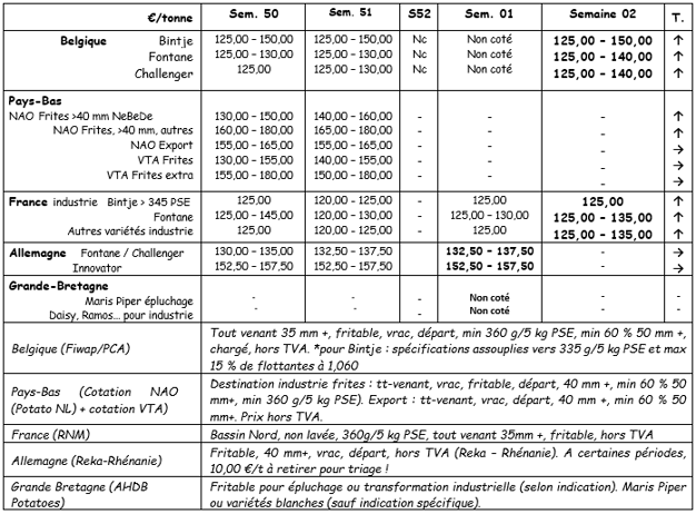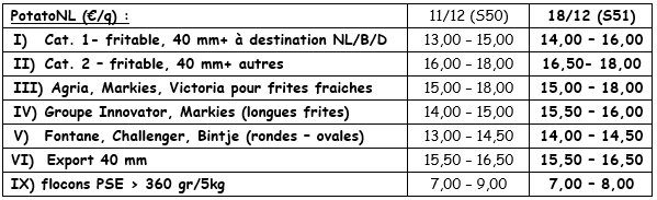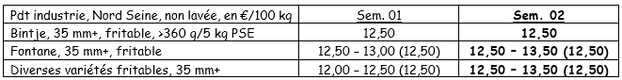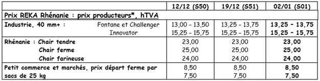 Fontane: 12,50 - 14,00 €/q; Chargen mit großen Kalibern und Kartoffeln mit einer guten Kochzeit werden von Exporteuren für maximal 15,00 €/q für England (für Industrie und Schäler) gekauft;