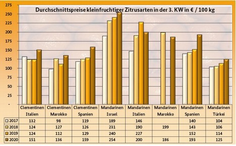 Aus der Türkei stammten Nadorcott, die hinsichtlich ihres Aromas in Hamburg Wünsche offenließen. Außerdem trafen erste türkische Murcott und Nova ein, die ab und an einen flotten Absatz erlebten. Mit marokkanischen Produkten wurden das Sortiment ergänzt. Obwohl diese in Berlin mit 1,60 bis 2,- € je kg recht günstig waren, generierten sie kaum Zuspruch, da sich israelische Orri im Fokus der Vermarktung befanden. Die Bedeutung von Clementinen schränkte sich ein. Spanische Chargen bestimmten dieses Segment, vorrangig Clemenules. Sie büßten aber an Beachtung ein. Dies war zum einen mit ihrer abschwächenden Qualität und zum anderen mit den ausgedehnten Zufuhren von Mandarinen zu begründen.