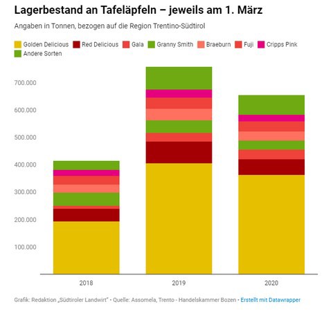 Laut den Erhebungen von Assomela und Handelskammer lagerten in den Genossenschaften in Südtirol mit Stichtag 1. März insgesamt 656.063 Tonnen Tafelware. 2019 waren es zum gleichen Zeitpunkt 756.805 Tonnen, im Jahr 2018 noch 415.060 Tonnen gewesen. Rund die Hälfte der lagernden Bestände sind Äpfel der Sorte Golden Delicious (364.338 Tonnen), in der Reihenfolge nach Menge folgen die Sorten Red Delicious (57.868 Tonnen), Fuji (36.237 Tonnen) und Gala (34.295 Tonnen).