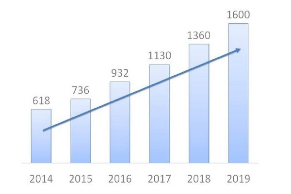 Umsatzwachstum im deutschen Online-Lebensmittelhandel seit 2014 (in Millionen Euro). Im Durchschnitt stieg der Umsatz um 22% pro Jahr.