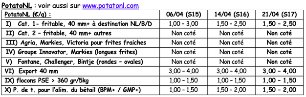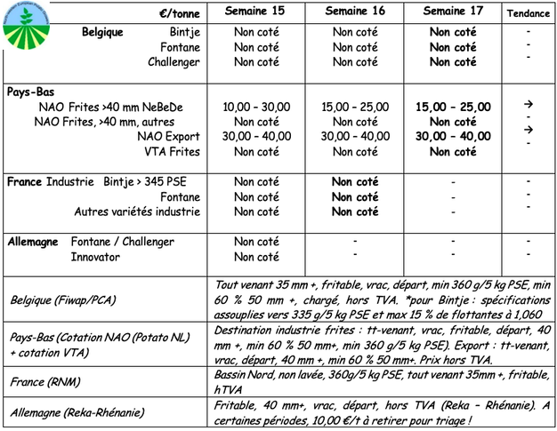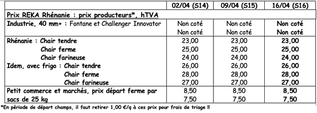 Nach den guten Verkäufen um Ostern ist der Handel wieder ruhig, bleibt aber gut. Die Einkäufe auf dem Bauernhof steigen. Die Lieferungen/Exporte nach Osteuropa nehmen zu. Der Anbau von Frühkartoffeln ist beendet, gefolgt von den Sorten in der Zwischensaison und den Sorten zur Konservierung.
