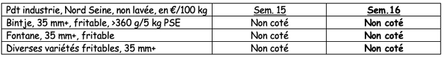 Industriekartoffeln: Das Arbeitstempo der verschiedenen belgischen Einheiten variiert stark (von 20% bis fast 100%) je nach Art des Produkts (frische Pommes, gefrorene Pommes, Spezialitäten, Kartoffelflocken, Pommes…) und auf den Märkten (europäische Supermärkte, Fast Food, europäischer oder globaler Export…). Dieses Tempo variiert auch von einer Woche zur anderen, abhängig von den Verkäufen (Aussichten), der Verfügbarkeit des Personals ... oder der (langsamen) Wiedereröffnung der Snackbars (frische Pommes). Die Priorität besteht darin, die (exklusiven) Verträge zu kündigen. Auf dem freien Markt gibt es fast keine Einkäufe, und selbst die überschüssigen Mengen werden immer weniger verkauft (und immer häufiger unbezahlt gelassen). Die einzigen beobachteten Transaktionen betreffen Viehfutter und Biogas zu Preisen zwischen 0,50 und 1,50 €/q, sogar 2,50 €/q für Kartoffelflocken.