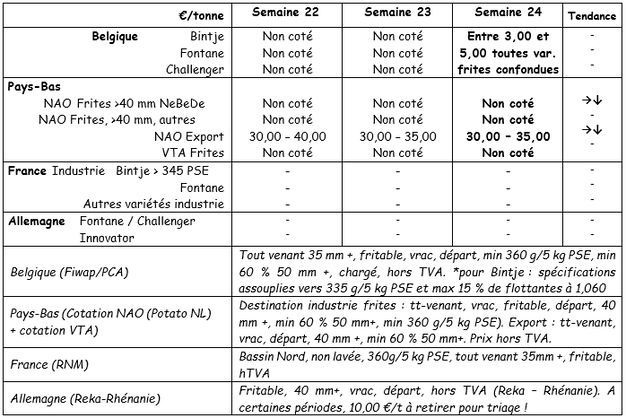 Laut VTA wird der Markt allmählich wieder lebendig. Die Preise für Kartoffeln für Pommes Frites liegen zwischen 3,00 und 5,00 €/q. Diese Kartoffeln sind hauptsächlich für den Export bestimmt.
