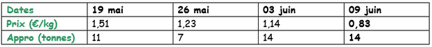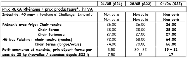Einheimische Frühkartoffeln: Die Verkäufe auf dem Bauernhof und auf den Märkten (Pfalz, Rheinland etc.) nehmen allmählich zu. Die Preise bleiben fest. Die ersten geschälten Kartoffeln werden Mitte Juni erwartet. Rheinland, Frühkartoffeln: zwischen 76 und 84 €/q, je nach Sorte, Qualität und Lage. Pfalz: zwischen 64 €/q (weiches Fleisch) und 66 €/q (festes Fleisch).
