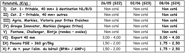 Industriekartoffeln: Der Markt erholt sich langsam, und die industrielle Aktivität (45 bis 100%) schreitet weiter voran, da die Sperre allmählich nachlässt und sich der Verkauf von verarbeiteten Produkten verbessert. Abhängig von den Fabriken und ihren Bedürfnissen (manchmal nach bestimmten Produkten) liegen die Erzeugerpreise zwischen 3,00 und 5,00 €/q. Die Qualität der Kartoffeln verschlechtert sich langsam (obwohl die Farbe der verschiedenen Lagerkartoffeln gut bleibt), mit einem Verlust an u.a. Festigkeit und Keimung. Daher möchten einige Käufer sicherstellen, dass sie gute Produkte haben, solange diese verfügbar sind. Es scheint bereits sicher zu sein, dass die Mengen der frühen Kartoffeln, die innerhalb weniger Wochen verfügbar sein werden, kleiner als normal sein werden, was den derzeit stärkeren Trend beeinflussen kann.