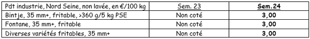 Preis für alle Kartoffeln: 35 mm +, min. 60% 50 mm, min. 360 g/5 kg PSE, lose, 'Pommes Frites-Qualität', Export, ohne MwSt., Direkte Lieferung: Bintje, Fontane, Challenger: Kein Angebot aufgrund fehlender Transaktionen für die Branche.