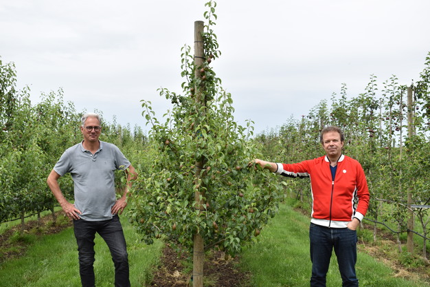 Im Testgarten Randwijk gibt es seit 2007 Birnenbäume der Xenia. Im Jahr 2020 handelt es sich um einen halben Hektar konventioneller und 3000 Meter Bio-Birnen dieser Clubsorte, die für verschiedene Anbau-Demonstrationen und Forschungen verwendet werden. "Wir haben damals damit begonnen, zu schauen, was der optimale Wurzelstock und Zwischenstamm für die Bäume ist", sagt Jan. "Was wir jetzt tun, ist, den Spritzplan für die Erzeuger zu perfektionieren und zu prüfen, wie wir die Größensortierung, den Geschmack und die Produktion der Birne am besten optimieren können. In diesem Jahr werden wir zum ersten Mal auch die Anbau-Demonstrationen mit der Lagerforschung kombinieren. Schließlich sind beide stark miteinander verbunden, so dass dies Vorteile bieten kann."