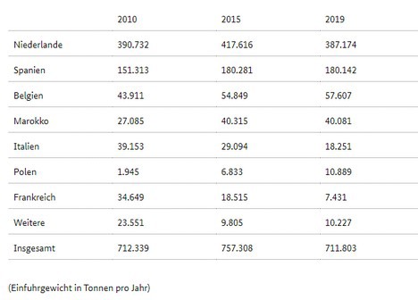Seit 2010 ist die jährliche Erntemenge von Tomaten in Deutschland nach Angaben des Statistischen Bundesamtes von rund 73.300 auf knapp 107.000 Tonnen gestiegen. Dennoch stammen die meisten Tomaten aus den Nachbarländern. Nahezu 80 Prozent der Gesamtimporte kamen 2019 aus den Niederlanden und Spanien. Während sich die Einfuhren aus Italien und Frankreich mehr als halbiert haben, steigen die Einfuhren aus Polen: