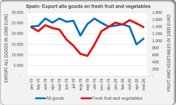 All dies auf der Grundlage der exportierten Mengen. Aus Sicht des Wertes ergab sich ein anderes Bild. Selbst im Mai war der Wert der spanischen Exporte von frischem Obst und Gemüse mit 1,3 Milliarden Euro fast gleich hoch wie im Vorjahr, während der Exportwert in den ersten vier Monaten bei frischem Gemüse und Obst größer war als letztes Jahr. Auffällig ist der starke Rückgang der gesamten spanischen Warenexporte seit dem Ausbruch der Corona-Krise. Im Januar und Februar waren die spanischen Warenexporte in diesem Jahr fast gleich hoch wie im Vorjahr, aber im März waren sie um 14% und im April und Mai mit 41% bzw. 35% deutlich geringer als im Vorjahr. In absoluten Zahlen gingen die spanischen Gesamtexporte in beiden Monaten um 10 Milliarden Euro zurück. Im April und Mai betrug der Anteil von frischem Obst und Gemüse an der Gesamtmenge fast 10%, verglichen mit 5% im Jahr 2019.