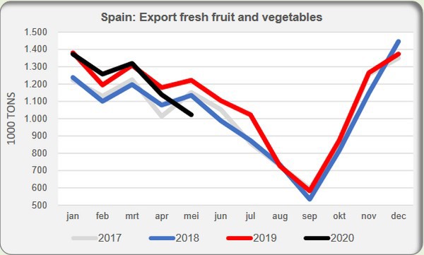 Von Januar bis Mai lagen die spanischen Exporte von frischem Obst und Gemüse um 3% unter dem Vorjahreszeitraum. Im Vergleich zu den Vorjahren war sie aus den Eurostat-Zahlen deutlicher zu erkennen. Bemerkenswerterweise wichen die Exporte in den ersten vier Monaten nicht allzu sehr von den gleichen Monaten des Vorjahres ab. Im Mai war der Export von frischem Obst und Gemüse jedoch um nicht weniger als 16% niedriger als im Mai 2019. Auch im Vergleich zu Mai 2017 und 2018 hinkten die spanischen Exporte in diesem Jahr hinterher.