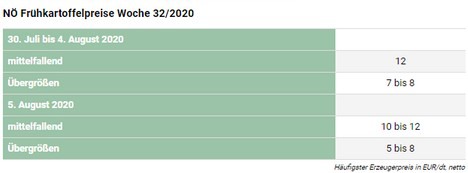 Erfreulich ist der im Vergleich zu den Vorjahren geringere Schädlingsdruck. Der Drahtwurm ist nicht verschwunden, betroffen sind derzeit aber lediglich vereinzelte Partien. Die Erzeugerpreise liegen zumeist auf Vorwochenniveau, allerdings hat sich die Tendenz der Preise in Niederösterreich weiter abgeschwächt. In Niederösterreich, dem Burgenland und der Steiermark wurden zu Wochenbeginn für mittelfallende Ware meist 12 Euro/100 kg bezahlt. Für Übergrößen lagen die Preise bei 7 bis 8 Euro/100 kg - In Oberösterreich wurden zu Wochenbeginn unverändert bis zu 22 Euro/100 kg bezahlt.