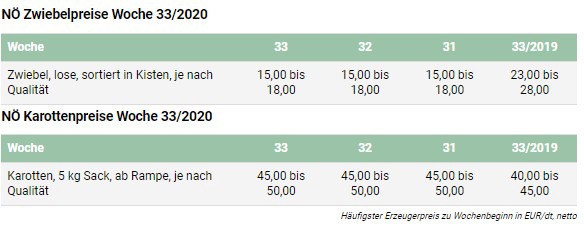 Der niederösterreichische Karottenmarkt bleibt von ruhigem Geschäftsverlauf geprägt. Der Inlandsbedarf kann mit dem verfügbaren Angebot gut gedeckt werden. Bei den Erzeugerpreisen gibt es keine Änderung.