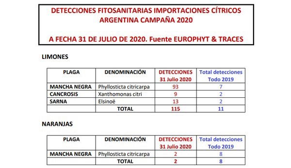 Bis zum 30. Juli wurden bei argentinischen Importen, insbesondere Zitronen, 117 pflanzengesundheitliche Erkrankungen wie Black Spot (Phyllosticta citricarpa), Zitruskrebs (Xanthomonas citri) und Zitrusschorf (Elsinoë) nachgewiesen. Die Situation ist viel ernster als im letzten Jahr, als nur 21 Funde gemeldet wurden.