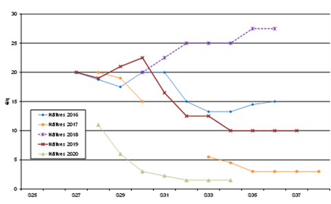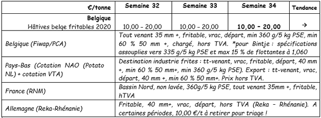 Es gibt noch keinen Freihandel. Mit Ausnahme der vertraglich vereinbarten Mengen zeigen die Käufer praktisch kein Interesse an den überschüssigen Tonnen. Das Angebot nimmt zu und die Exporte gelten als ruhig, da einige begrenzte Mengen nach Afrika und in die Karibik geliefert werden, basierend auf Preisen zwischen 15,00 und 17,00 €/q (sortiert nach Größe und Sorte, verpackt für den Export). Die Exporteure warten auf die Öffnung der senegalesischen Grenzen. Die heimischen Frischmärkte laufen sehr gut. Die Industrie stoppt frühe Kartoffelverträge und kauft keine seltenen Kartoffeln.