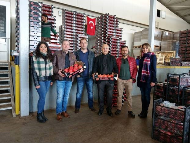 Das Team in der Türkei, das die Granatäpfel verpackt, die Qualität kontrolliert und sich um die Zollpapiere kümmert. Rene ist der Zweite von links, neben ihm Marc Seelen und Herr Gursoy von Gorsoy Tarim und Yasin Karaca, der Mitarbeiter von P. Seelen in der Türkei. Die beiden Damen kümmern sich um die Qualitäts- und Exportdokumente. [Anmerkung: Das Foto wurde vor den Maßnahmen zur Eindämmung von COVID-19 aufgenommen.]